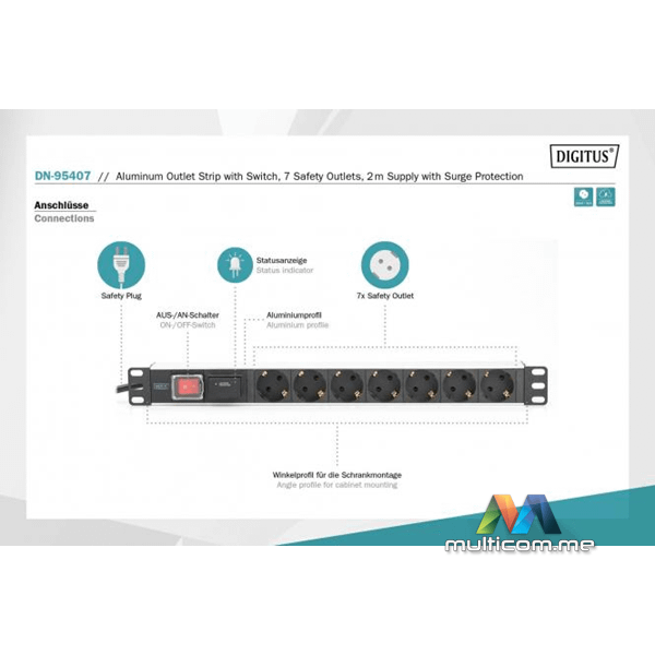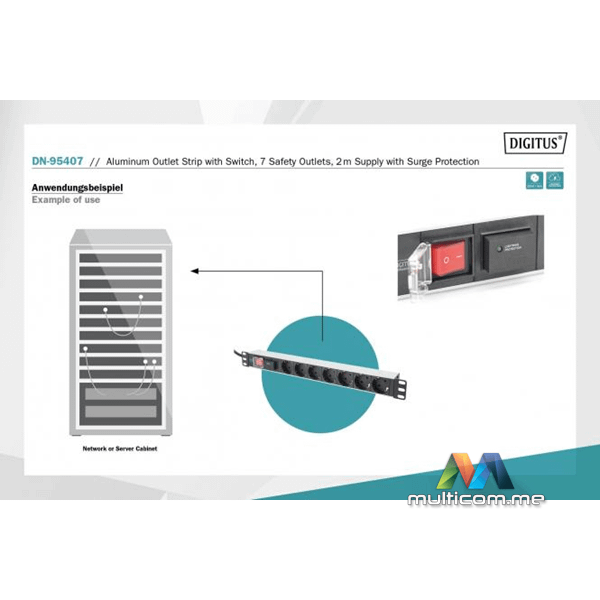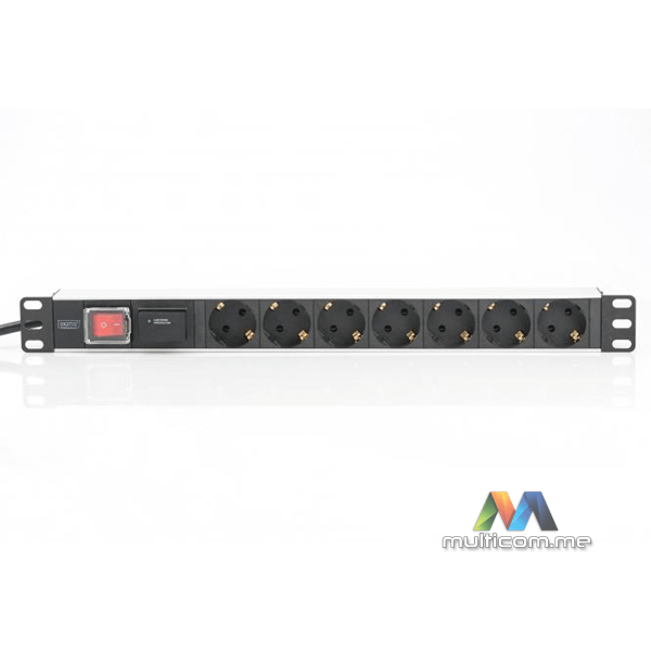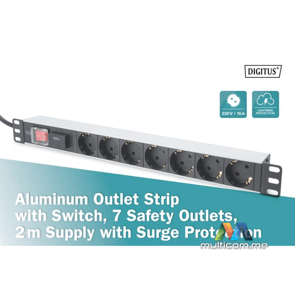 Digitus DN-95407 aluminijumska napojna letva sa prekidačem │ 7 sigurnosnih utičnica │ Napojni kabl dužine 2m │ Zaštita od prenapona