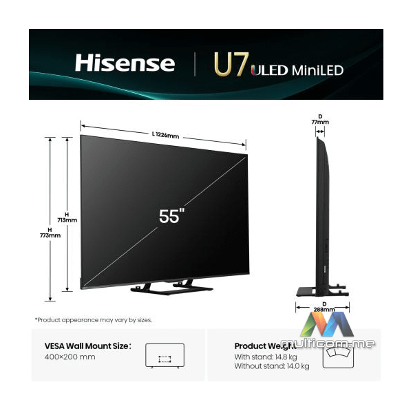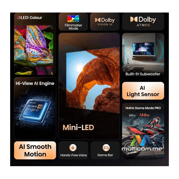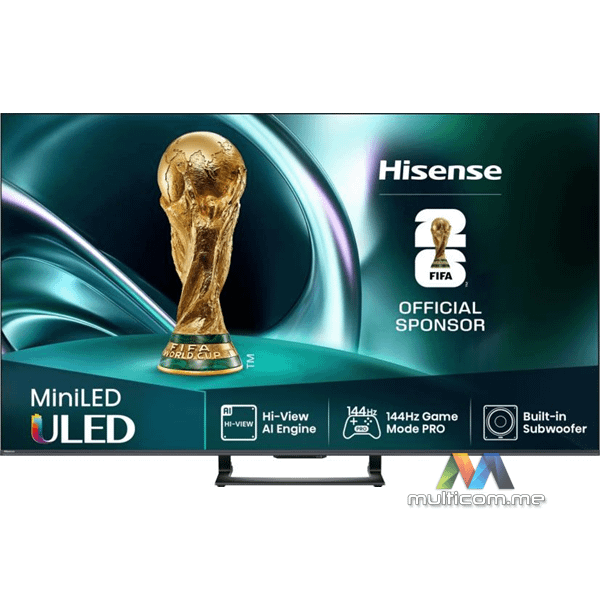 Hisense 55U7Q televizor │ ULED Smart TV │ 4K Ultra HD rezolucija │ Dolby Atmos zvuk │ DTS Virtual X │ VIDAA Smart OS │ Hi-View AI Engine │ 144Hz Game Mode PRO │ Ugrađeni sabvufer